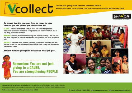 वी-कलेक्ट क्लोथ्स अभियान के पोस्टरों में भी ‘देने’ की बजाय ‘रीसाइक्लिंग’ के विचार पर जोर दिया गया है और यह गुजारिश की गई है कि आप साफ, और पहनने लायक कपड़े दें – ऐसे कपडे जो नए पहनने वालों को भी उतने ही आरामदेह लगें जितने अब तक आपको लगते थे।
