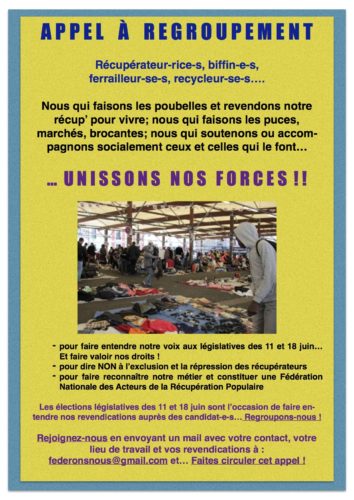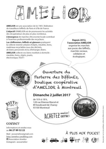 On July 2nd, the Association of Individual and Organized Local Economic Recycling (AMELIOR) hosted the grand opening of its cooperative shop, “Parterre des biffinEs”. Featuring a materials library, a clothing-by-the-kilo sale, and a flea market, there were also a number of workshops, on dismantling and reusing electric and electronic materials, repairing computers, crocheting with plastic bags, framing paintings, and welding and making bicycle carts. Those who went could also enjoy live music, food, and an exhibit of photos and drawings of waste pickers.