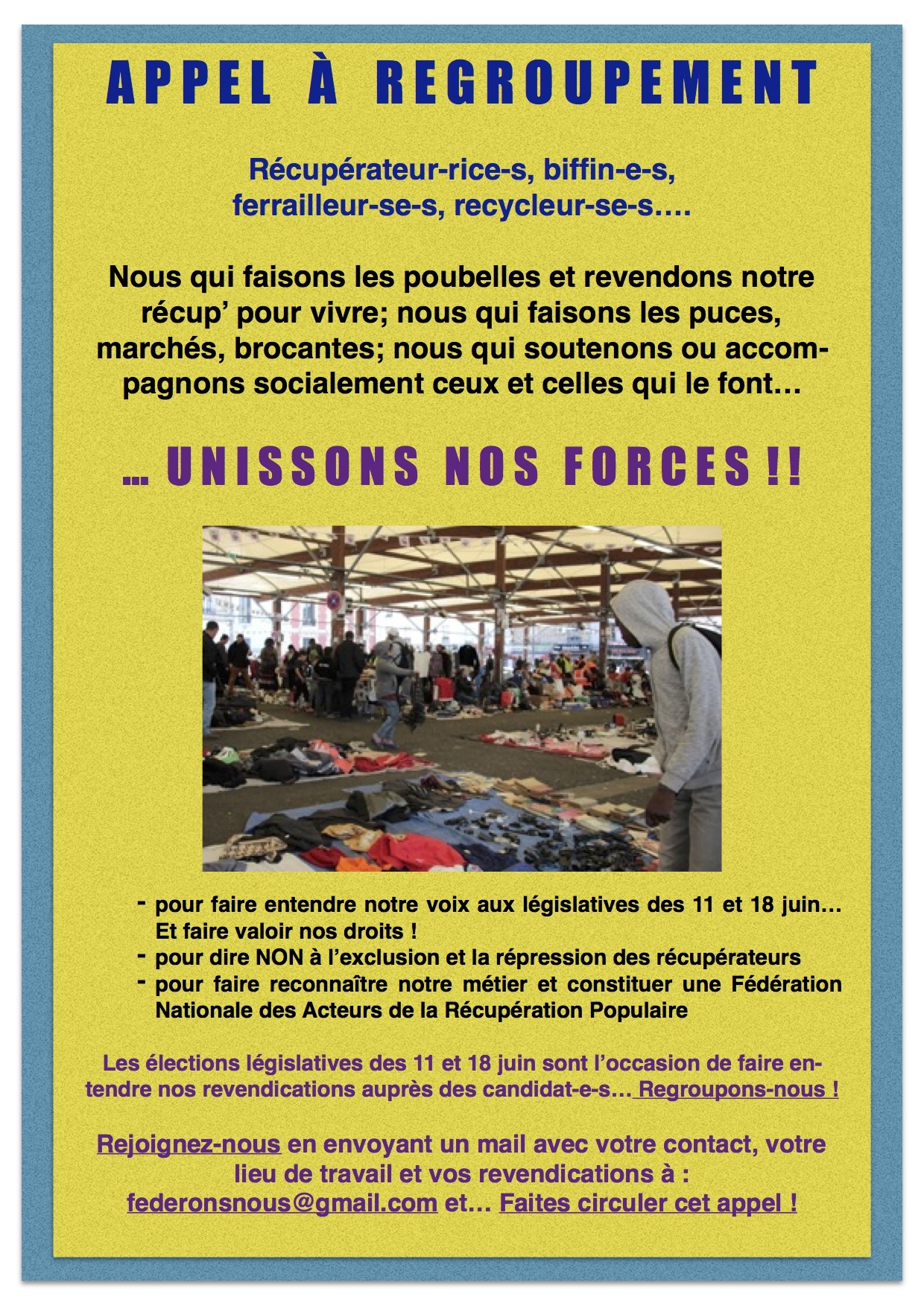 We had our monthly flea market, attended by about 200 waste pickers from 46 districts, with thousands of buyers and sellers since March 2013. Our authorized sale booths of recuperated goods, featuring about 12 tons of recycled, often unique, products, are within everyone’s price range. It is this recognized work of recovering and reselling that has formalized sustainable recycling in Paris for a thousand years (over many years?).