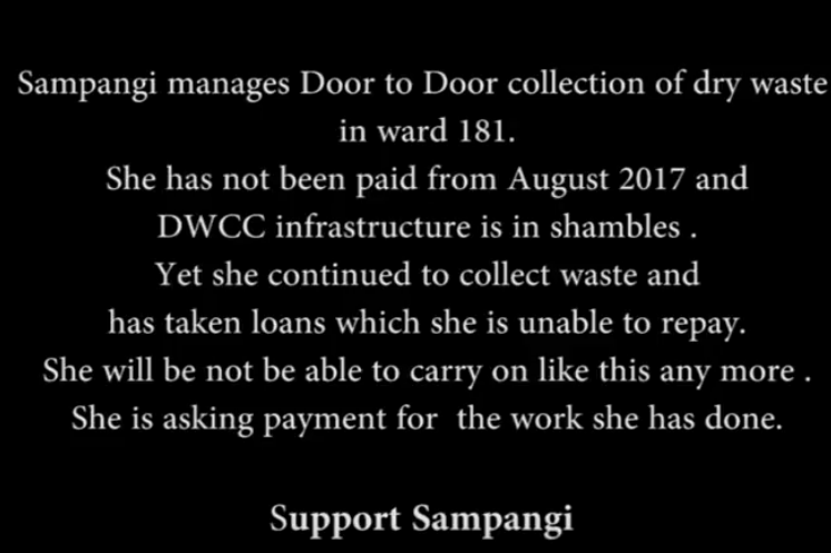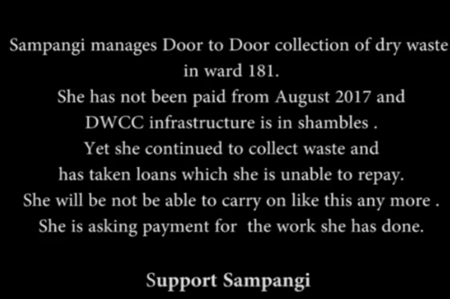 Sampangi is erstwhile waste-picker, operating DWCC in municipal ward no. 181. The DWCC alloted to her is in shambles. This didn’t hinder her from getting to work. She is engaged in door to door collection of dry waste as was asked to do so by the municipal authorities. She has not been paid since August 2017. She has taken the loan and won’t be able to repay it because of non-payment by Bangalore’s municipal authorities. She is asking for the payment for her work. The payment is her right which is constantly being denied to her. Support Sampangi by calling the South Zonal Commissioner of Bruhat Bengaluru Mahanagara Pallike (Greater Bangalore Municipal Corporation- BBMP).