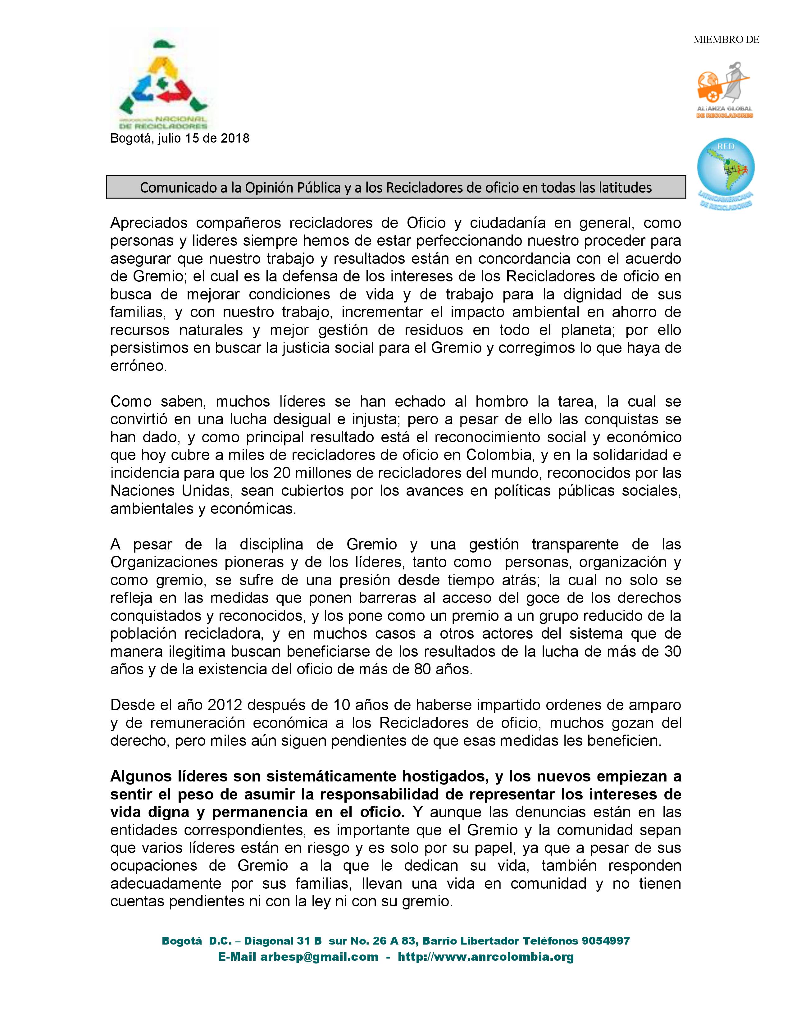 The Association of Waste pickers of Bogota (ARB) published this report (download PDF) describing the current condition experienced by trade union leaders in Colombia. This association represents thousands of the city’s informal waste pickers and, thanks to the union struggle, it has secured the 2011 court ruling which considers that waste pickers can compete with waste companies for municipal contracts, among other achievements. However, all the rights earned by the waste picker union brought along threats, persecutions and public denigration, followed even by assaults and theft at the union office.