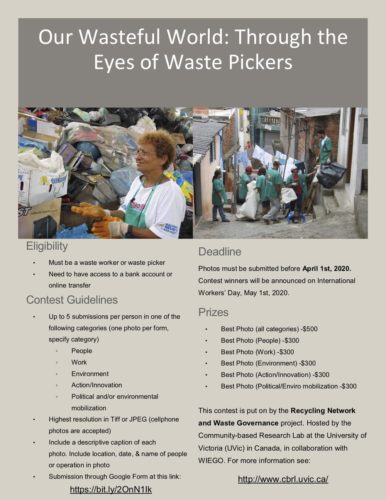 Waste pickers and waste workers are exposed to waste and the resources found in waste through their everyday practices. Lifelong learning has turned them into distinct experts on waste. Given their experiences with waste they have significant contributions to make to help address the many challenges posed by production, consumption, and waste. We are inviting waste pickers and informal waste workers to participate in this photo contest geared towards promoting the gaze of waste pickers and waste workers. We specifically encourage women and Youth to participate. An initiative of the Recycling Network and Waste Governance project from the Community-based Research Lab, hosted in the Department of Geography at the University of Victoria, in Canada in collaboration with WIEGO. More info about the photo contest. Dead line is  April 1st, 2020.