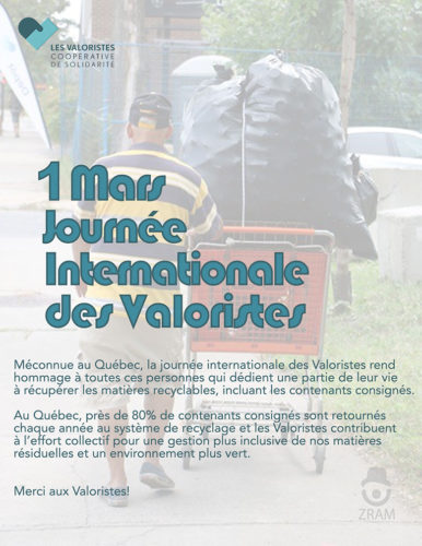 Little-known in Quebec, International Waste Pickers’ Day pays tribute to all those people who dedicate part of their lives to recovering recyclable materials, including returnable containers. In Quebec, almost 80% of the content returned is returned to the recycling system each year and waste pickers contribute to the collective effort for more inclusive management of our residual materials and a greener environment. Coop Les Valoristes.