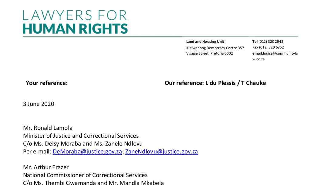 This is the letter that Lawers for Human Rights sent to the Minister of Justice, the National Commissioner of Correctional Services, the Regional Commissioner of Correctional Services and the Pretoria Area Commissioner on June 3rd, 2020 (download original PDF document).