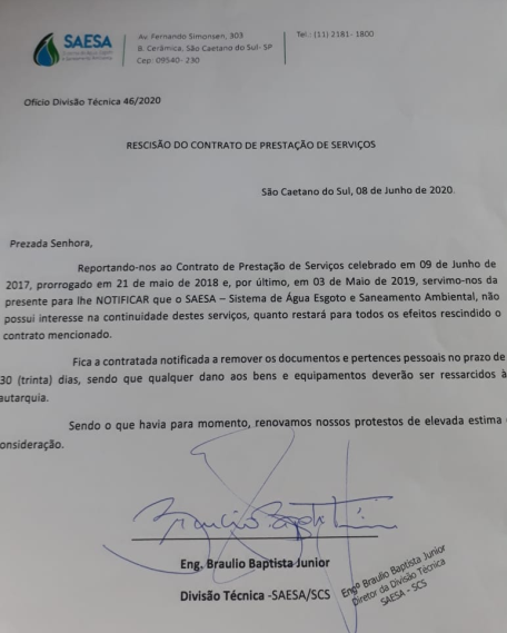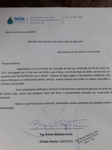 On June 8, 2020, amid the worst sanitary, economic and humanitarian crisis of the new millennium, the autarchy responsible for waste management in the municipality of São Caetano do Sul, one of the richest in the ABC region in São Paulo, cancelled the contract they had with the Waste Pickers and Recyclers Cooperative from São Caetano do Sul (COOPTRESC) since 2016. The note above sets a 30-day deadline for the cooperative members to abandon their workplace, with no justification. This is an inhuman measure taken within a context of crisis in which all the work routines have been violently altered. It should be stressed that several municipalities, including the capital city, São Paulo, aided waste pickers who were prevented from working due to the crisis.