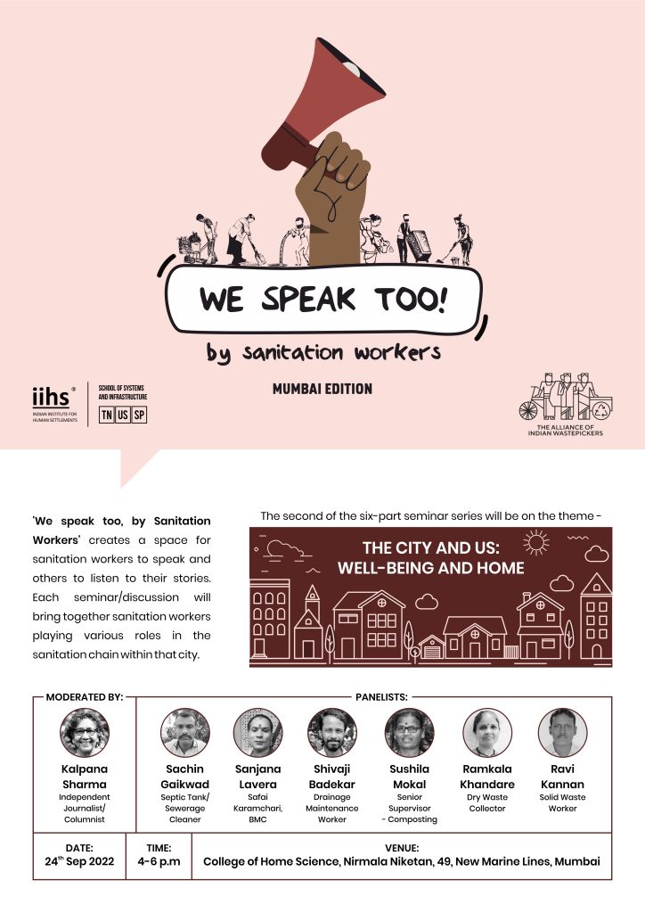 A multi-city series of curated seminars — ‘We speak too, by Sanitation Workers’, co-organised by Indian Institute for Human Settlements (IIHS) and the Alliance of Indian Waste Pickers, provides a platform for sanitation workers playing various roles in various urban contexts to come together to narrate their stories, challenges, and experiences for diverse audiences.
