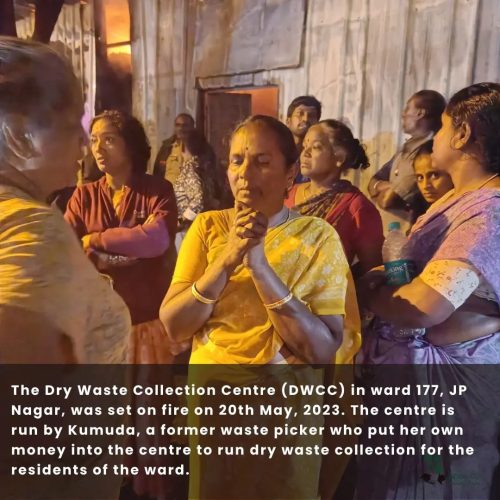 The Dry Waste Collection Centre (DWCC) in ward 177, JP Nagar (India), was set on fire on 20th May 2023. The centre is run by Kumuda, a former waste picker who put her own money into the centre to run dry waste collection for the ward’s residents and with the BBMP’s support.