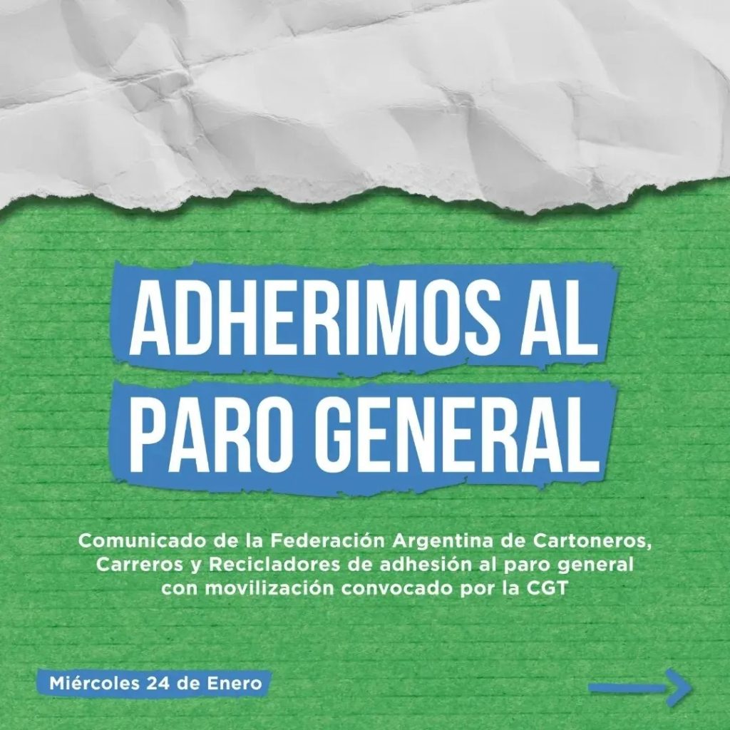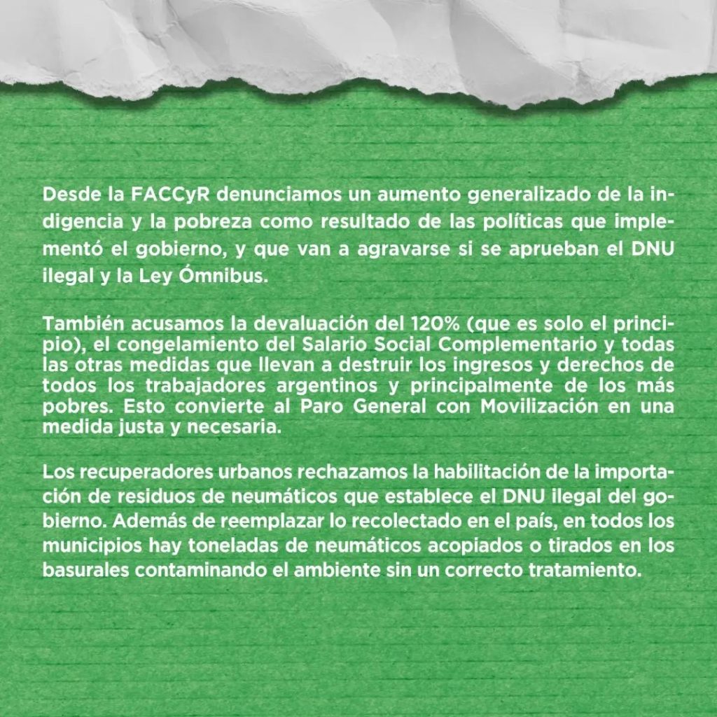 The International Alliance of Waste Pickers stands shoulder-to-shoulder with its affiliate FACCyR (Argentine Federation of Waste Pickers) and working class comrades in the historic January 24th general strike against the encroaching power of Capital and its threat to workers’ rights. This demonstration of solidarity echoes through brown America and beyond, reminding us of the hard-won social justice that Argentina once championed.