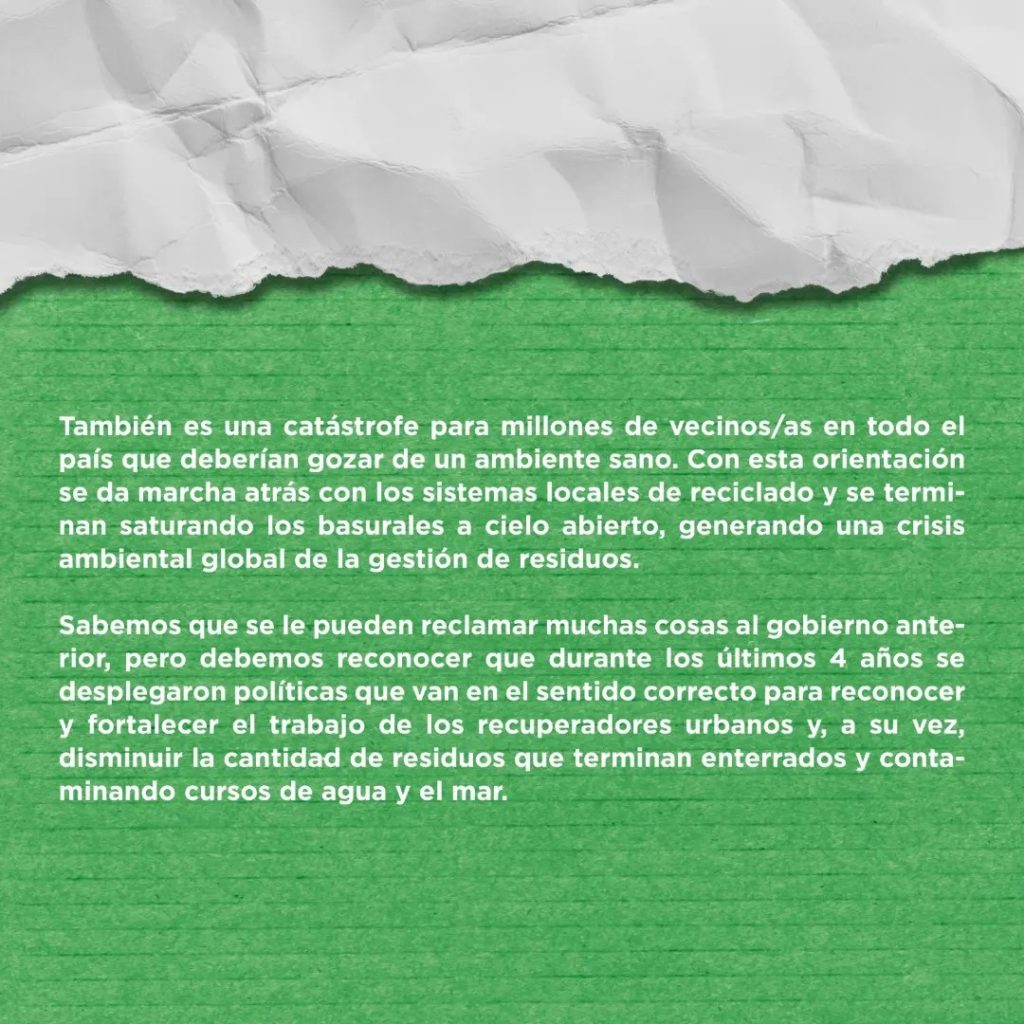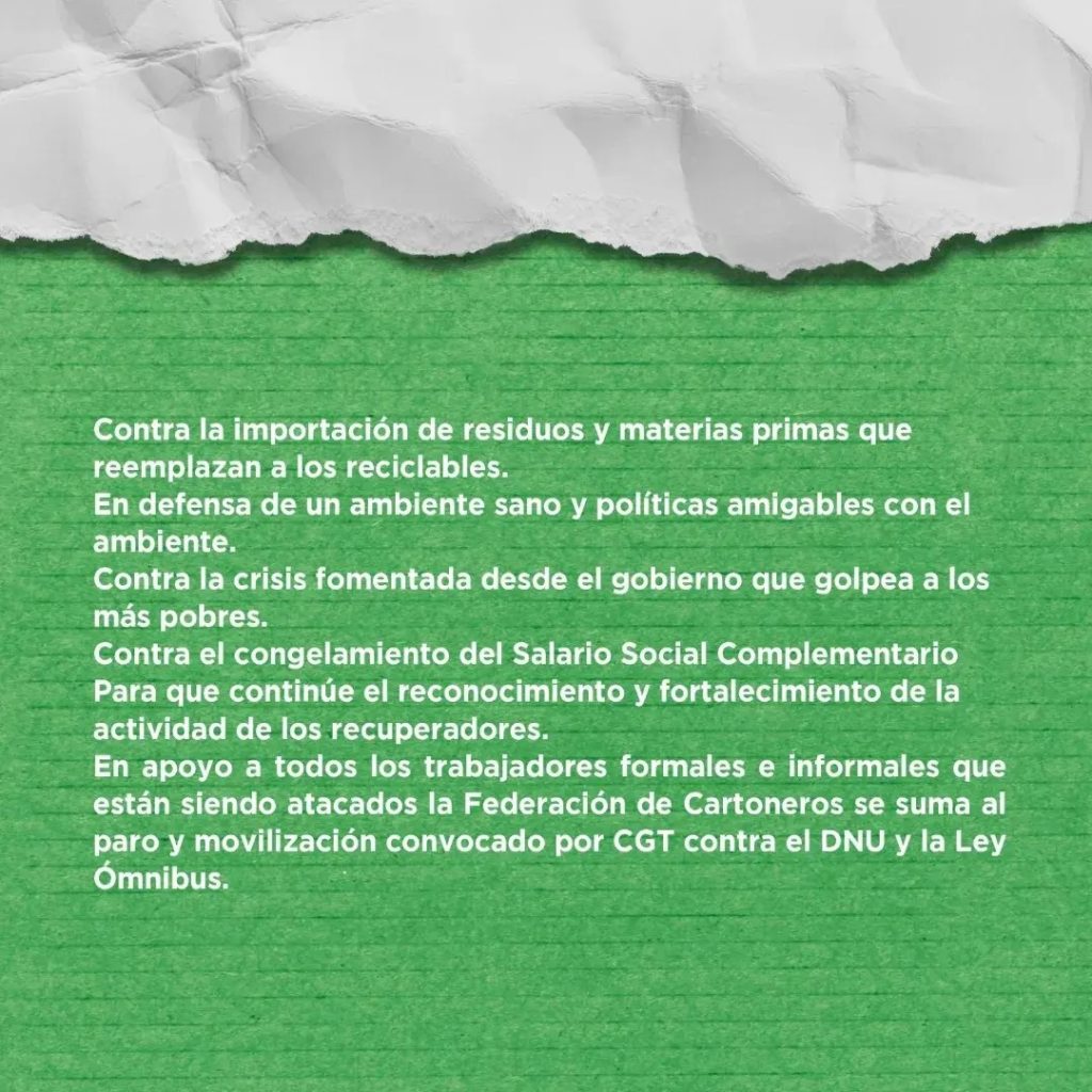 We fervently hope they can counter this devastating threat to hard-won rights in a nation whose flag has long flown for social justice, inspiring countless others in Latin America and beyond. We stand vigilant and will strongly condemn any violation of the right to protest during this general strike, for it is crucial to Argentina’s democracy and essential for safeguarding the first elected congress of the waste pickers in the region, which will take place in Buenos Aires this May.